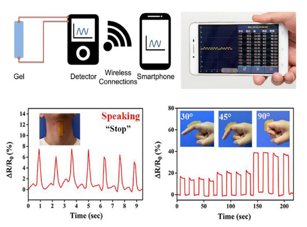 此外,高光辉教授课题组利用凝胶材料在柔性传感、能量存储等等领域也进行了大量的深入研究,实现了导电凝胶器件对人体运动信号进行实时、精准监测,在心脑电图医用电极、高安全性离子电池、绿色超级电容器等方面具有潜在的应用价值。系列研究成果以我校为独立通讯单位在ACS Appl. Mater. Interfaces(美国化学会应用材料界面,一区,IF=8.097)发表5篇学术论文,以及在Chemical Engineering Journal(化学工程杂志,一区,IF=6.735)发表2篇学术论文。