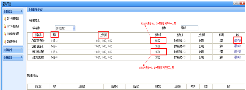(1)点击个人调课申请,系统会显示教师自己的课程安排,如图4所示