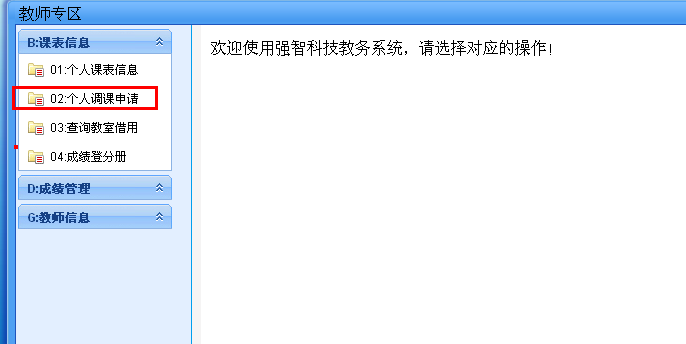 3.进入系统后点击“教师专区”——“B.课表信息”——“02.个人调课申请”,即显示本学期各位教师所上课程。如图3