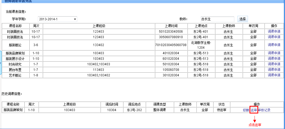 (1).点击个人调课申请,系统会显示教师自己的课程安排,如图14所示