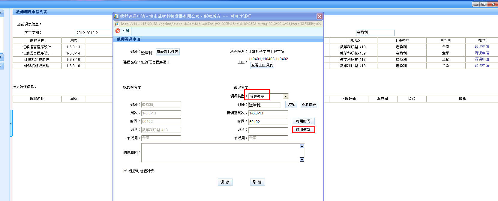(4).选择时间地点完成后,将调课原因填写好后,“保存”后点击送审,完成调课申请。如图13