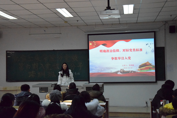 分党校第六期入党积极分子培训班“明确政治信仰、对标党员标准”专题党课于12月13日在南湖校区科研楼2114开展。本次党课由学院学生党支部书记、2019级辅导员李秀绒老师主讲。