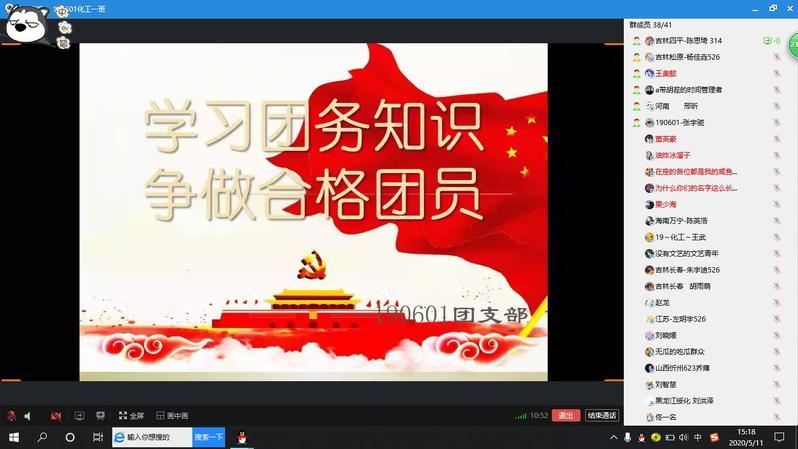 新闻网讯(通讯员刘晓媛 李紫嘉)为使同学们更好地掌握共青团工作的基础理论知识,促进团员青年思想提升。5月11日,190601班团支部开展“学习团的知识,争做合格团员”线上主题团课。本次团课由团支部书记陈思琦主持,全体团支部成员参加。