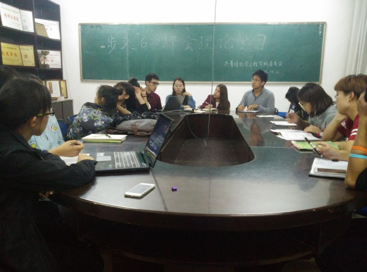 团委于2016年9月12日晚上8点在南湖化工楼四楼会议室进行理论学习,本次会议由组织部副部长刘懿宽主讲,参加本次理论学习的成员有:校团委学生常务副书记孔令姝、号角理论学习小组全体成员、2015级各班代表。